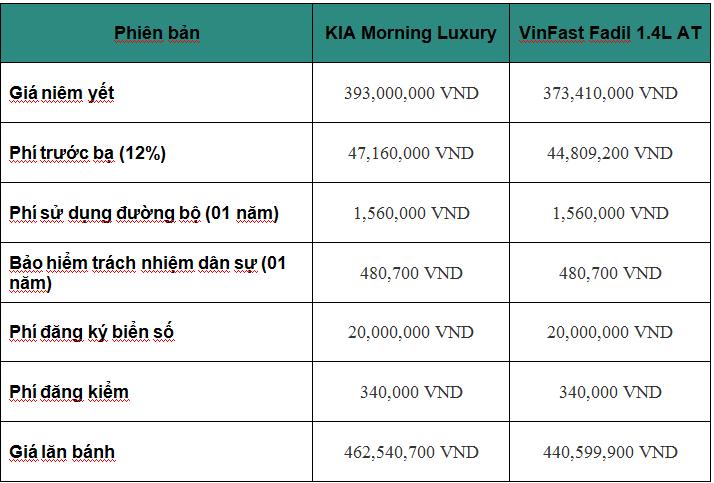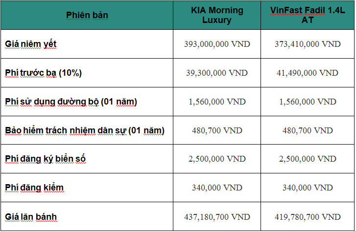 Tham khảo giá lăn bánh KIA Morning và VinFast Fadil tại Hà Nội